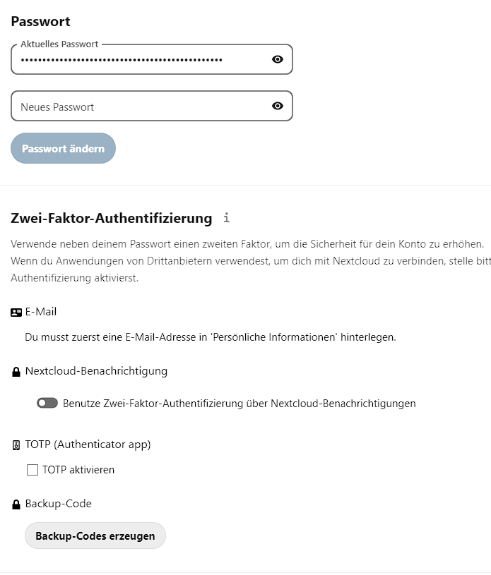 Hier kann jeder sein perönliches Passwort ändern und eine Zwei-Faktor-Authentifizierung einstellen.