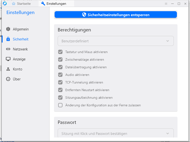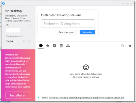 - RustDesk läuft, ohne Installation, jedoch müsste jedes Mal die Netzwerkverbindung neu eingerichtet werden. Dann könnte damit schon gearbeitet werden.