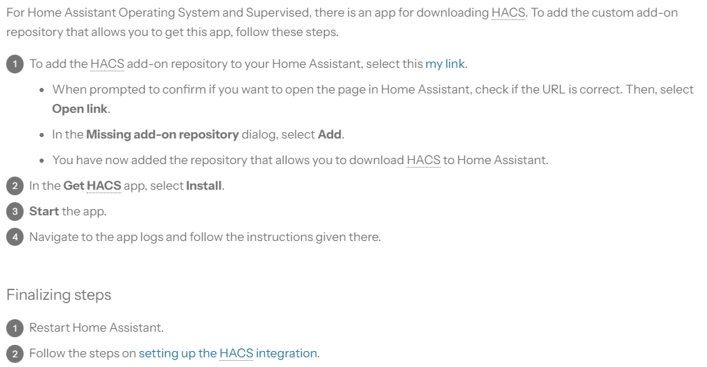 einfach die Webseite: https://hacs.xyz/ öffnen, und danach installieren. Hier keine weitere Anleitung - denn die installierung könnte sich ändern.